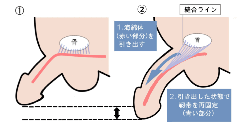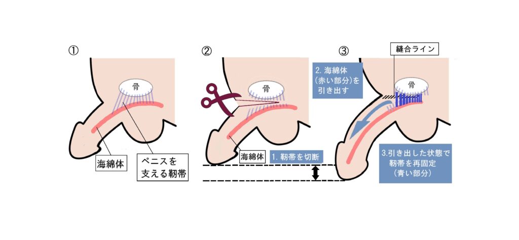 ペニスを支えている靭帯(じんたい)という膜を引き出すことで、ペニスを外に出やすくし長くする長茎術です。
