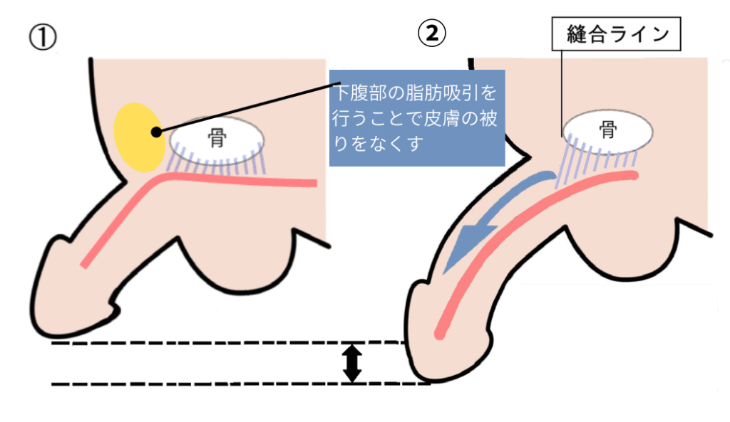 ペニスの根本を覆っている恥骨周辺の皮下脂肪を吸引することで、埋もれているペニスを引き出して通常時の長さを長く見せる手術です。